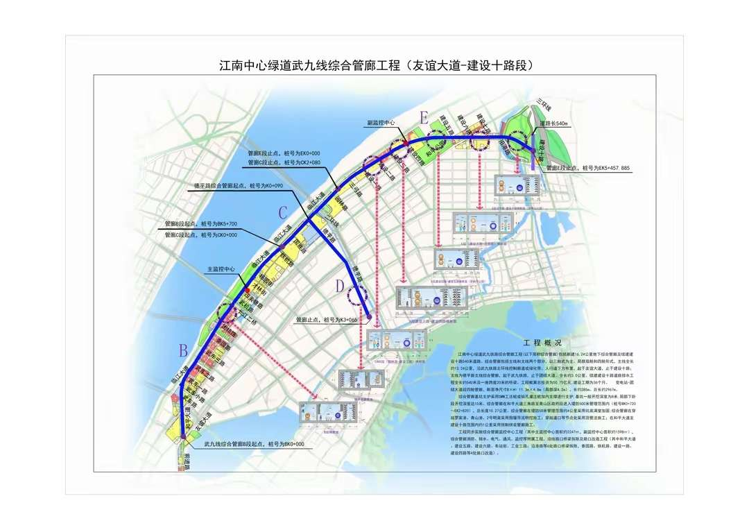 作为省市两级重点工程,武九综合管廊全长约16.2公里,是武汉市城市地下综合管廊专项规划确定的重要干线管廊,创下多个“国内之最”。它是国内城市核心即老城区单次建设规模最大(长度、断面)的综合管廊,是服务城市核心功能区(武昌滨江商务区、青山滨江商务区、华中金融城)数量最多的综合管廊。