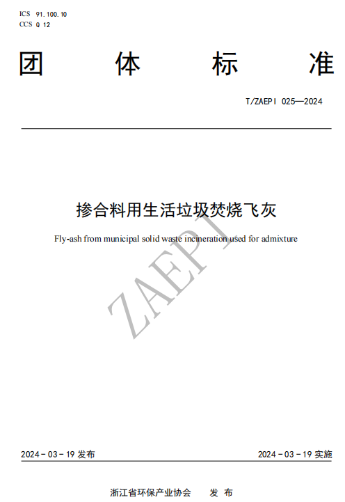 《掺合料用生活垃圾焚烧飞灰》标准号T/ZAEPI 025-2024,该标准由浙江京兰环保科技有限公司和浙江大学主编,由浙江省环保产业协会于2024年3月19日批准发布,2024年3月19日起实施。文件规定了掺合料用生活垃圾焚烧飞灰的术语和定义、技术要求、试验方法、检验规则、包装、标志、运输和贮存。文件适用于低温热分解及水洗解毒工艺处理后符合 HJ 1134规定的掺合料用生活垃圾焚烧飞灰,为后续飞灰处理产物的产品化进一步拓宽了应用场景。