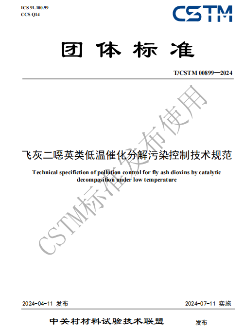 《飞灰二噁英类低温催化分解污染控制技术规范》标准号T/CSTM 00899-2024,该标准由中国环境科学研究院和湖州京兰环保科技有限公司主编,由中国材料与试验标准化委员会于2024年4月11日批准发布,将于2024年7月11日起实施。文件规定了生活垃圾焚烧飞灰二噁英类低温催化分解处理技术的术语和定义、一般要求、工艺技术与污染控制要求、处理后飞灰的污染控制要求、包装运输和贮存要求、人员与制度要求、环境管理要求。文件适用于采用低温催化分解技术实现生活垃圾焚烧飞灰中的二噁英类解毒过程的污染控制,为国内首个飞灰低温热分解专有工艺技术规范。