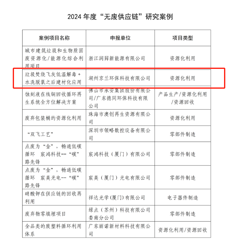 根据案例研究及汇报情况,本年度评选出10项“无废供应链”评价试点及10项“无废供应链”研究案例。湖州京兰环保科技有限公司凭借 “垃圾焚烧飞灰低温解毒 + 水洗脱氯之后建材化应用” 项目脱颖而出,成功入选 “无废供应链” 研究案例。